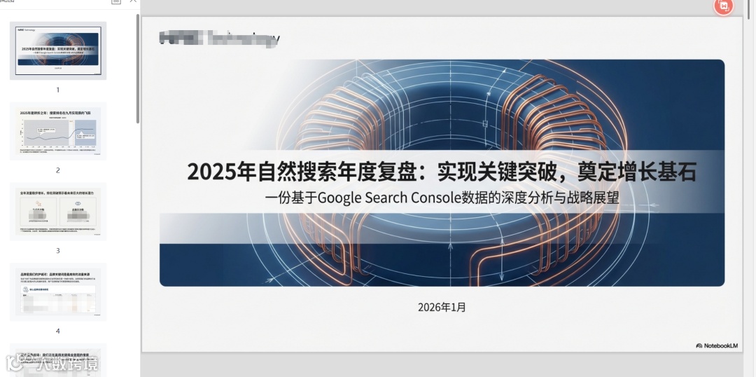 本文将介绍一种高效方法:利用Google免费AI工具NotebookLM,结合GSC与GA4真实数据,快速生成结构清晰、洞察深入的年度汇报PPT,无需手动撰写内容或设计图表。