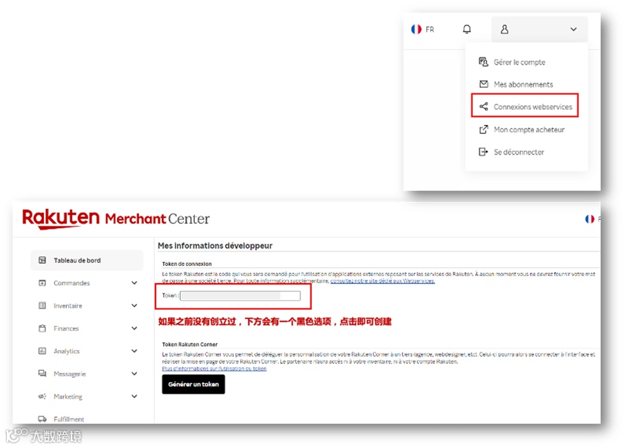 在进入Merchant Center时,点击右上角的小人图标,点击“Connexions webservices”,复制Token de Connexion。如果之前没有创建过,下方会有黑色按钮,点击按钮创建Token。