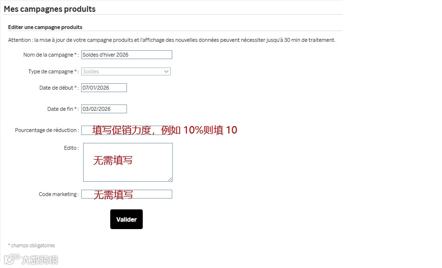 以上案例设置的是"Soldes"类型促销,系统已根据大促法定期限为您设置好起止日期,您只需设置打折力度。