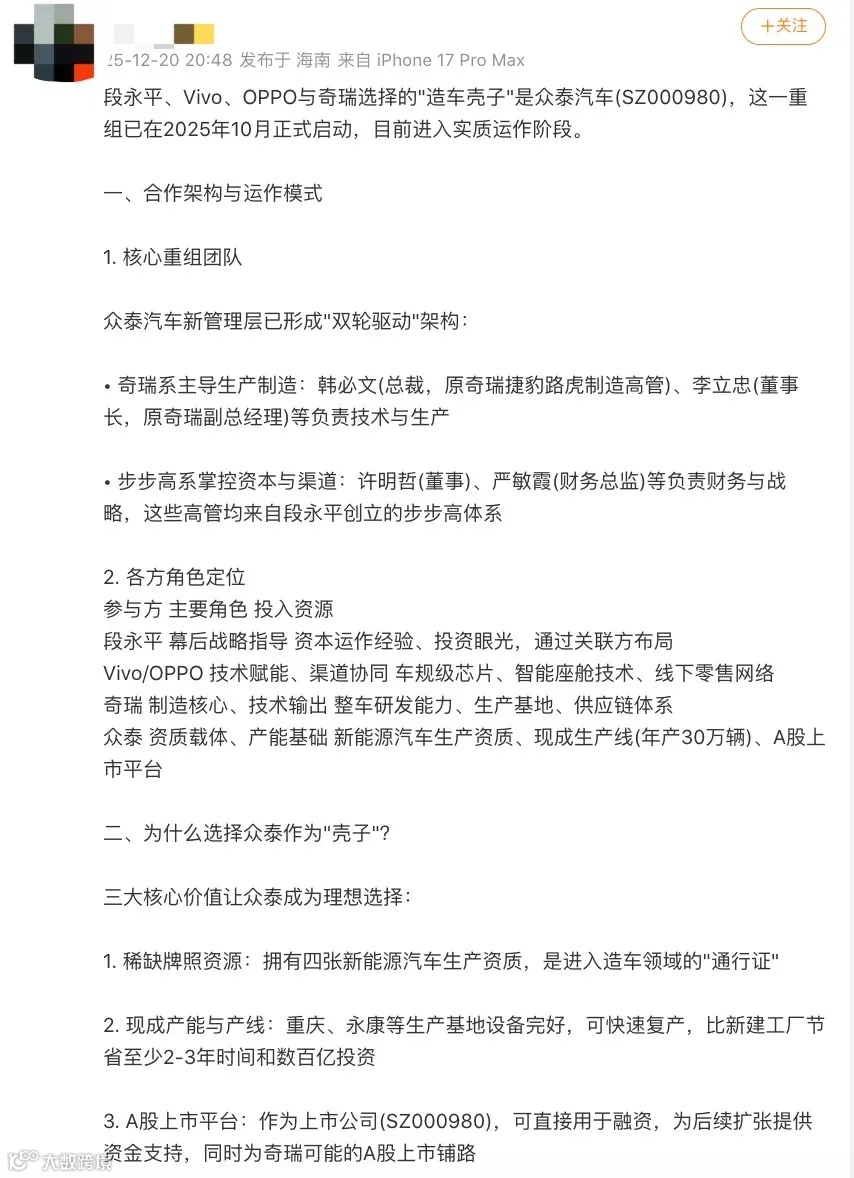 12月23日消息,近日,网络上有传言称,段永平要带领OPPO、vivo一起参与众泰汽车重组造车。有博主爆料称,这事从2025年10月就启动了,目前已进入实质运作阶段。据悉,在10月份众泰汽车的新一届董事会名单中,6个非独立董事里,3个有奇瑞背景,还有董事跟步步高系沾边。