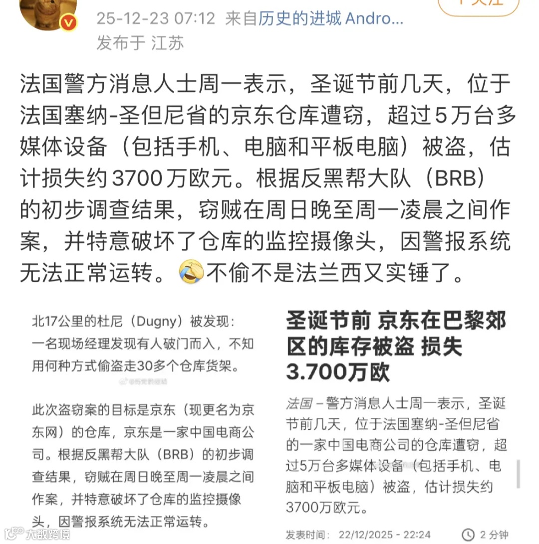 此前报道,京东位于法国塞纳-圣但尼省的仓库遭窃,超过 5 万台 3C 数码设备(包括手机、电脑、平板电脑、耳机等)被盗,价值约为 3700 万欧元(约合 3.06 亿元人民币)。报道称,仓库负责人22日早上发现,有人撬开大门闯入,约有30个货盘失踪。