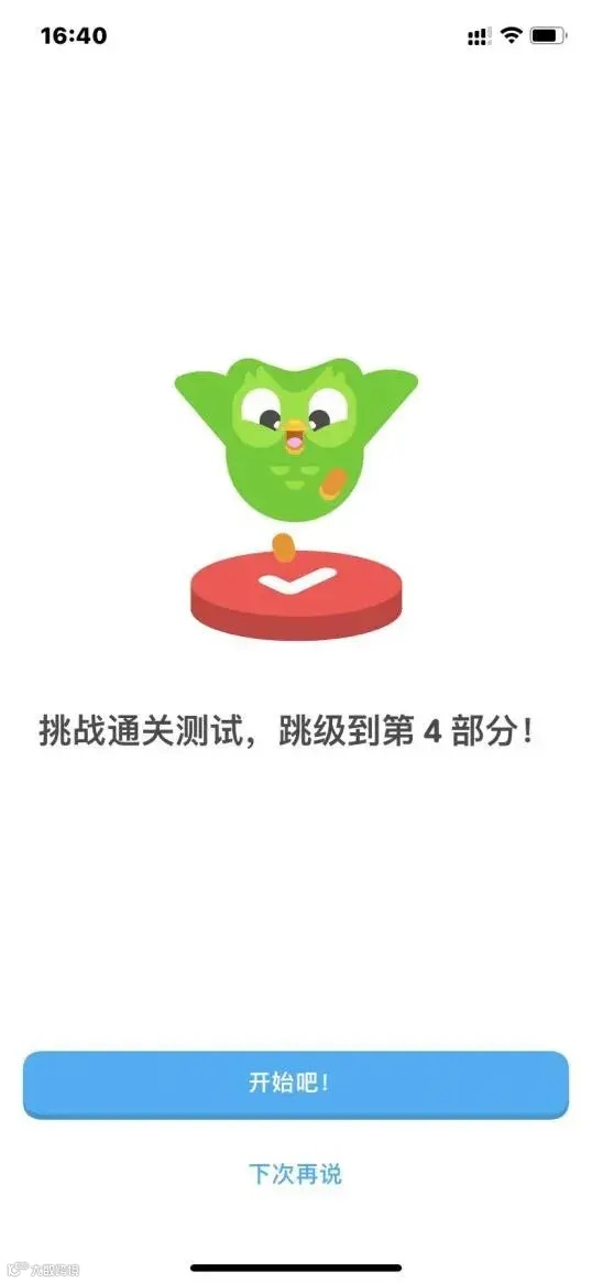 而在 Duolingo,“自由”体现在用户能力与课程难度的匹配,也就是如果我认为自己可以跳级,通过测试就能进入下一阶段,但其实也还是按难度爬坡,系统化学习。