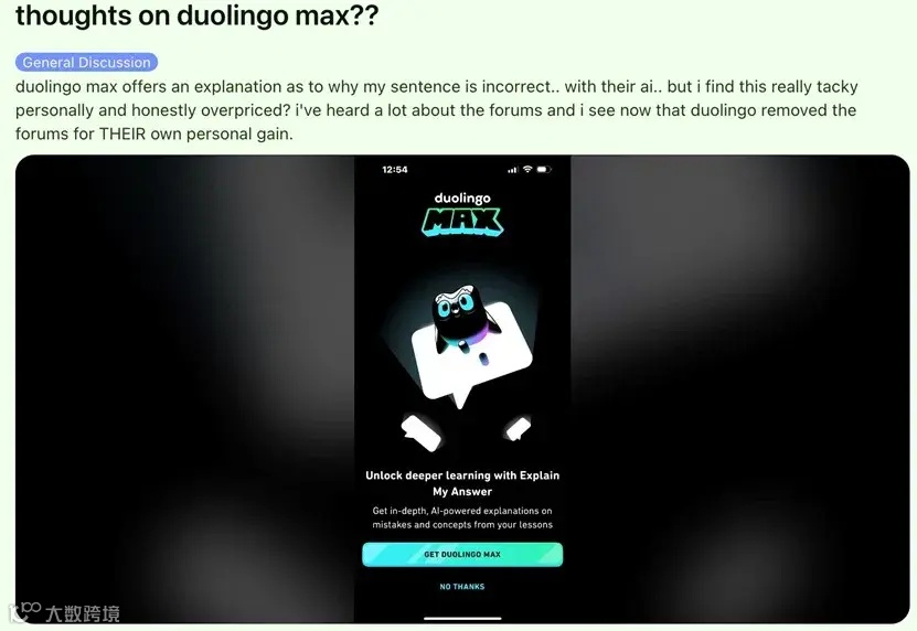 而其实,Duolingo 在去年 3 月就推出了能与 AI 对话的高级订阅模式 Duolingo Max,但是目前只能在少数几个国家,用英语学习法语/西班牙语时使用,有消息称,今年下半年将登陆日本市场,使用范围仍比较小。而且 Reddit 上用户评论认为 Duolingo Max “非常平庸,且价格很高”。