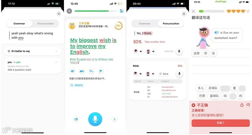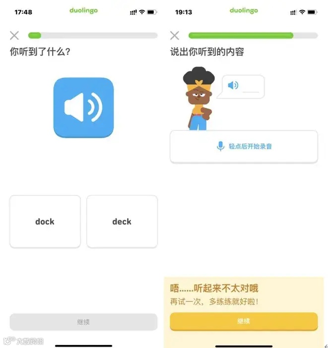 Duolingo 的反馈还停留在跟着单词/例句模仿发音的层面上,就算笔者故意说错,Duolingo 只会反馈错误,不会告诉用户哪错了,怎么改正,对用户发音的提升作用有限。