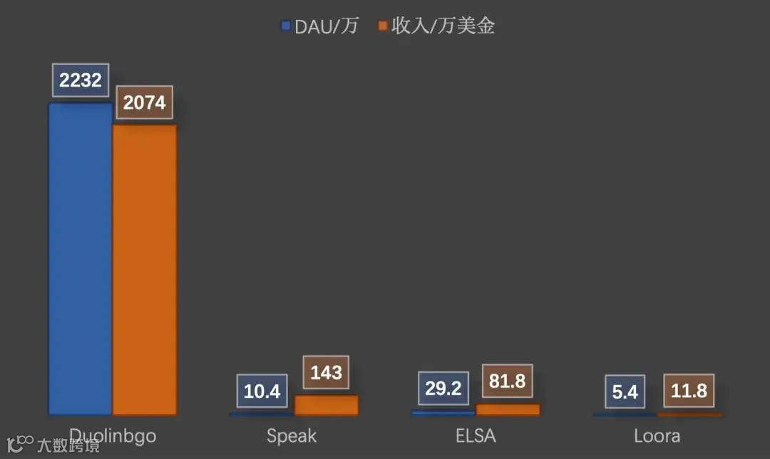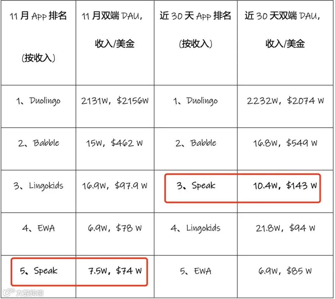 我们对去年 11 月写选题时的数据和现在的数据也进行了对比,发现 AI 语言学习产品(OpenAI 投资的 Speak)在收入和 DAU 上也确实在快速增长。
