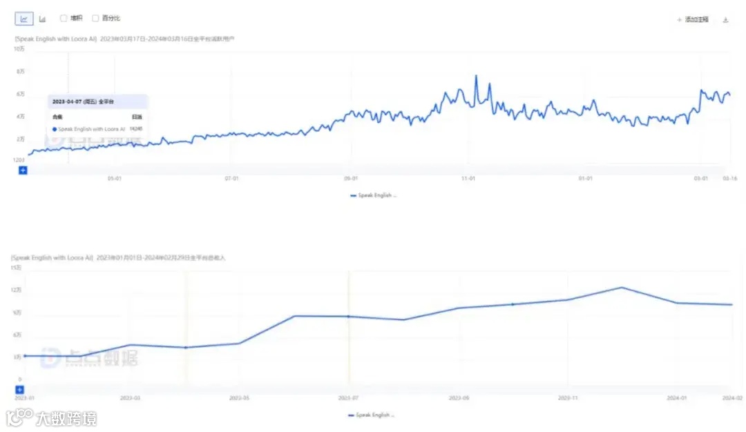 而除了 Speak 之外,其他几款拿到融资的 AI 语言学习产品,虽然成绩和主流产品还差很远,但也在努力进步中,8 个月融了 2000 万美金的 Loora,从这个成绩来看,反而还是“差生”了,资本给钱,可能是看增长势头。