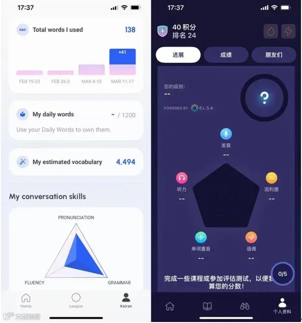 而从对用户英语水平的评价上,Duolingo 评价的维度基本上就是用户“闯关”的进度,也就是知识点学习的进度。而有了 AI 的加持,Loora 和 ELSA 可以在用户的学习过程中对口语能力进行实时反馈,而评价维度包括语法、发音、流利度、单词(ELSA 还有重音和语调),基本和雅思/托福口语考试的评价维度看齐,而这两种考试都是有真人考官参与评价的。