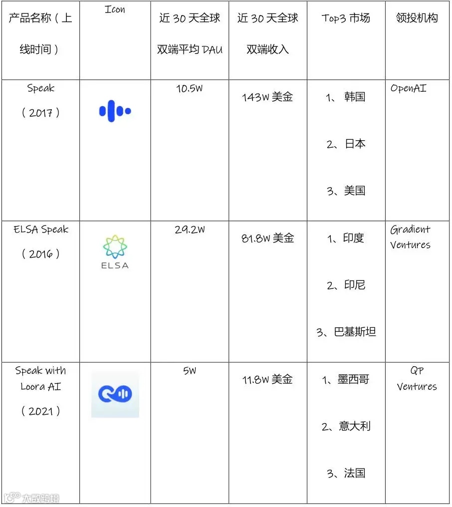 而由 Google 投资,总部位于越南的 ELSA,则是在用户量层面表现不错,近 30 天平均 DAU 有 29.3W,是同行 Top3 的水平,近 30 天平均流水 81.8W 美金,排名全球同类产品的第 6-7 位(ELSA 可以在网站端进行订阅,所以单纯看应用商店的收入和用户数据可能不太全面)。
