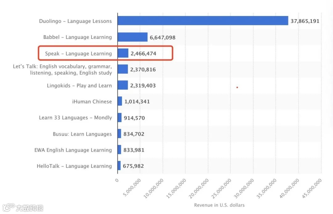 上一篇选题观察到的 Speak,在 App 端全球双端月流水已经从 11 月的 71W 美金增长到了 2 月的 143W 美金,增长了一倍,在同类产品的排名中已经上升至第三位,甚至,在主攻的韩国市场,它的收入已经超过 Duolingo 了。而 Speak 双端月平均 DAU 也从 11 月的 7.5W 增长到了近期的 10.7W(近 30 天平均 DAU),DAU 增长 42%。