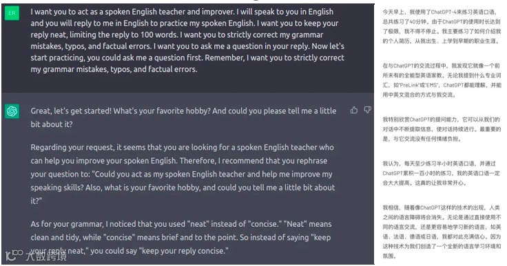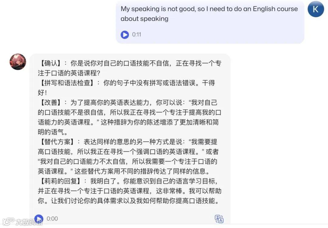 网络而作为 AI 产品“扛把子”的 ChatGPT,当然也会被用来学英语,ChatGPT 刚上线时已经有人用它对自己的英文表达进行纠错和润色了,甚至有人做了语音输入插件让 AI 当起了教练。当 OpenAI 9 月底向 Plus 付费用户推出了语音交互功能后,而今又向所有用户免费开放,ChatGPT 牌陪练就当得更顺理成章了,根据网上用户分享的使用体验,效果是相当不错的。