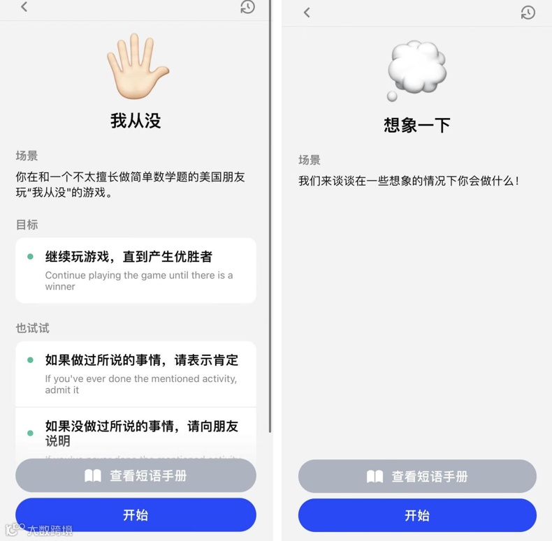 而以 AI 对话为核心的角色扮演和主题聊天两种课程形式,会作为课程中主要的练习手段,放在每天课程的最后一部分,6 天的课程中大概有 4 天会安排这类练习。用户在进入练习之前可以通过短语手册复习课程学习过的内容,以便更好地与 AI 进行对话,整体形式上和其他产品的 AI 口语陪练功能差别不大,用户可以在练习过程中随时查看 AI 对自己答案的评价。