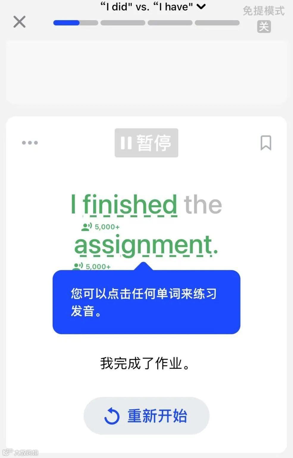 主要的课程形式是提前设计好的视频课程,语法、词汇、口语的演练,这几种课程中用户需要做的就是朗读例句,然后 AI 会通过语音识别功能判断用户的朗读是否正确,并给用户实时反馈,比如上图中,语音识别发现笔者少说了“the”,界面上就会用灰字显示。