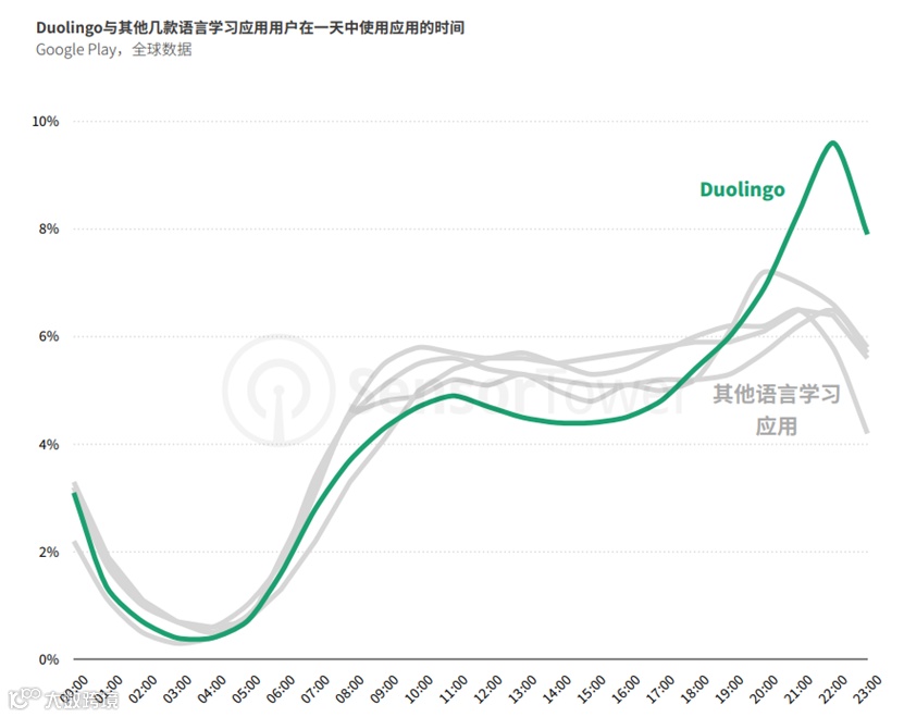 有 25% 的用户会在晚上 9 点到 11 点这个时间段使用 Duolingo,远高于其他语言学习 App。可以想象,很多用户在睡前接到应用推送,想起我今天还没有“连胜”,所以晚睡几分钟 Duolingo 一下,最终养成了习惯,开始自主进行学习了。