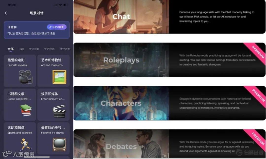 为了避免用户不知道与 AI 聊些什么,这些产品一般都会给用户提供很多可以选择的主题和场景,一方面限定场景能更有针对性的进行练习,另一方面也是考虑到备考雅思、托福等英语考试的用户有按主题练习口语的需求。此外,TalkPal 还提供与历史上角色进行对话的功能和辩论功能,以增加学习的趣味性,也是 AI 泛用性的一个体现。这里想重点说下 OpenAI 投资的 Speak,这也是 3 款产品中唯一一个有系统课程的 AI 语言学习产品,与聊天机器人差别最大,可能也是 Speak 获得 OpenAI 投资的一大原因。Speak 的总部位于美国加州,成立于 2016 年,一直致力于使用 AI 改变英语学习的体验,不是靠 AI 搞一波热度,2022 年它完成了由 OpenAI 领投的 2700W 美元 B 轮融资。