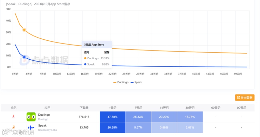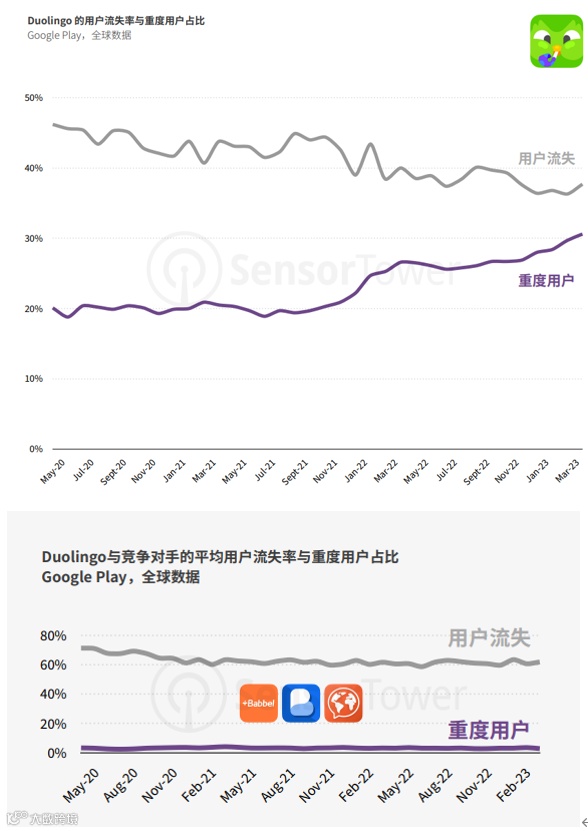 根据 Sensor Tower 数据,相比其他竞品 Duolingo 的重度用户要高 20%,用户流失率要少 30% 左右,而且这两项数据仍在持续改善。