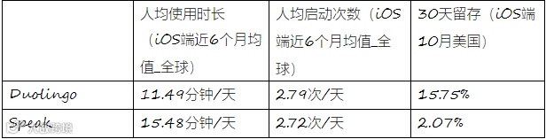 而对未来潜在的发展可能,我们也对 Duolingo 和 Speak 的数据进行更多维度的观察。鉴于 DAU、收入等都不具可比性,我们对人均启动次数、人均使用时长、以及留存等几个比较能够看出产品粘性的数据进行了观察。