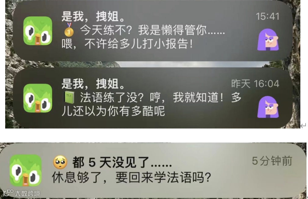 而我们一位 Duolingo 重度用户的同事表示,Duolingo 最狠的是,推送系统,完全拿捏人性。Duolingo 的推送内容有种“丧萌”的气质,通过带有情绪的内容引起用户的共鸣来重新进入 App 学习。如果用户点击手机推送,就会直接跳转到课程中,而不是跳转到首页让用户选择课程,最大程度减少用户半途放弃的可能性。
