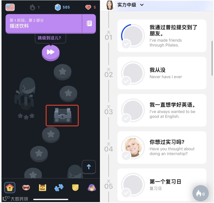 但 Duolingo 的课程排列则借鉴了游戏的闯关设计,将每天的课程包装成关卡,而且该课程的标题和摘要也不在课程按钮旁边显示,而是放在了页面的顶部。这个闯关的路径中,Duolingo 还设置了一些奖励,比如“宝箱”和“角色皮肤“等,它给了用户一个努力的目标:拿到宝箱,然后升级,在闯关过程中完成学习任务。