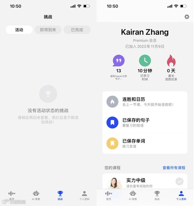 除此之外,Speak 还有挑战和个人资料两个一级标签。挑战标签会显示官方发布的一些挑战活动,但是笔者在测试的过程中一直没有看到挑战,可能是因为网络问题无法看到。个人主页标签主要显示的是一些学习的基础信息和成绩,来激励用户,此外用户也可以在这里复习保存过的单词与句子。