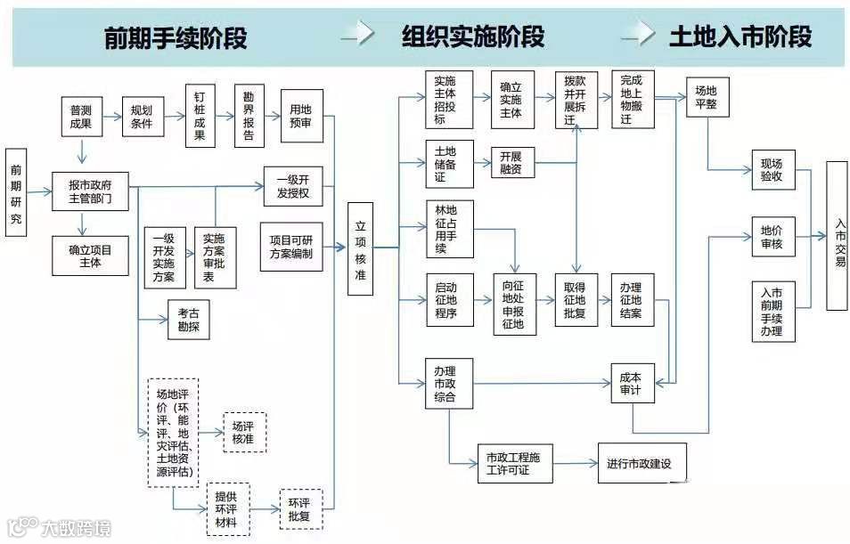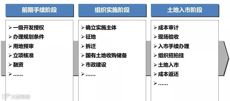 土地一级阶段包括“前期手续阶段”、“组织实施阶段”和“土地入市阶段”。
