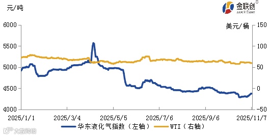 导语:与2024年相比,2025年全国液化气市场价格整体波动幅度较去年有明显收窄。截至11月7日,2025年全国液化气价格指数均值在4709点,较去年下跌5.59%。2025年全国液化气价格指数介于4285-5277点区间运行,其中最高点出现在4月7日,主要原因是中美关税政策影响,业者担忧后期缺货及成本大幅提升,进口商及部分炼厂惜售或停出自用,带动价格短暂大涨。最低点出现在10月22日,主要原因是国际及国内市场供应充裕,外盘持续低迷,抑制下游入市积极性。上游单位出货压力较大,导致价格跌至年内低位。