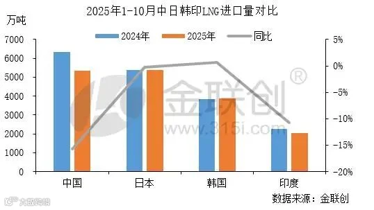 据金联创统计,2025年1-10月,亚洲主要消费国中日韩印共进口16604.86万吨LNG,同比去年下滑6.75%。其中除日本和韩国相较去年保持稳定外,我国LNG进口量同比大幅下滑15.69%,印度同比也下滑10.8。