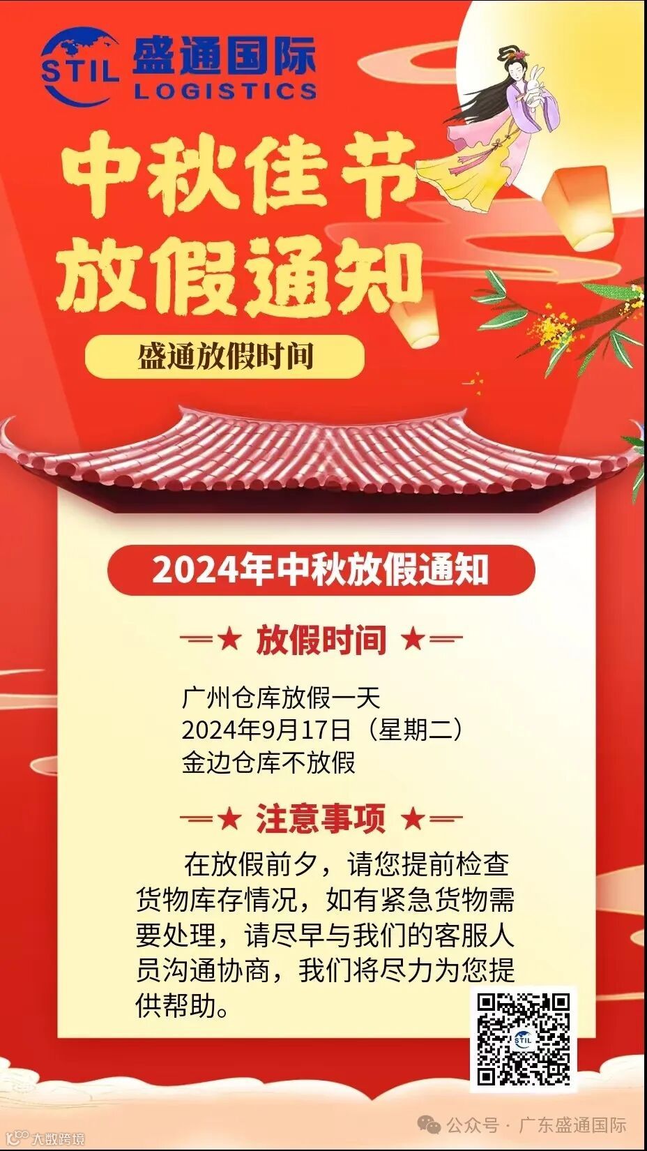 我司将于 2024 年 9 月 17 日(星期二)放假一天。放假期间,我司广州仓库将暂停收货和发柜服务。请您提前做好相关安排,以免造成不必要的困扰和损失。而位于金边的仓库将正常上班,如有相关业务需求,您可与金边仓库的工作人员取得联系。