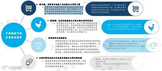 企业的养殖技术升级与新品类研发技术:培育满足多元化需求、适合中国饲养环境的标准化蛋鸡品种,有效提升蛋鸡良种覆盖率并提升生产标准化程度等,有利于企业开发新品类并提供高质量鸡蛋产品,进一步形成企业自身竞争优势,从而推动行业规模扩大。