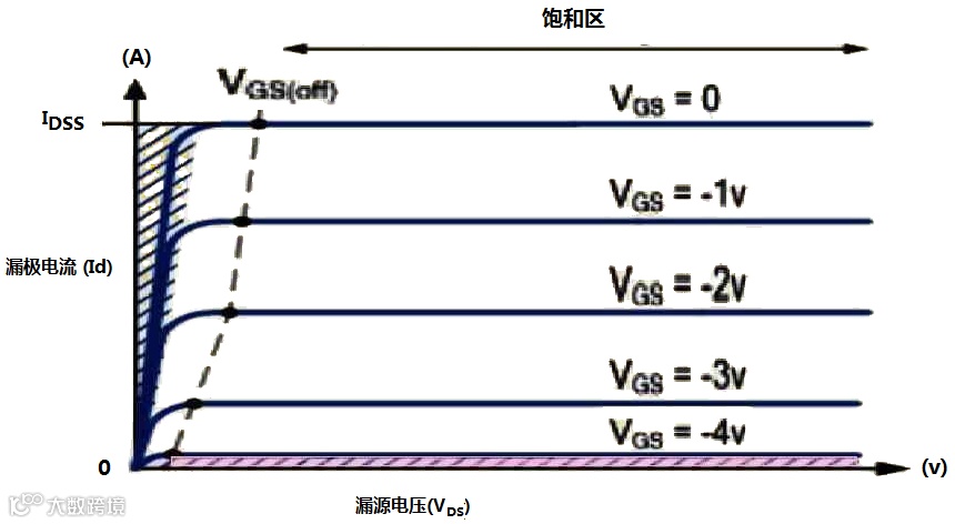 电压与电流关系 此时可将VDS视为该JFET的正向压降。该压降由不同栅极电压VGS下流过的ID电流大小决定。 -