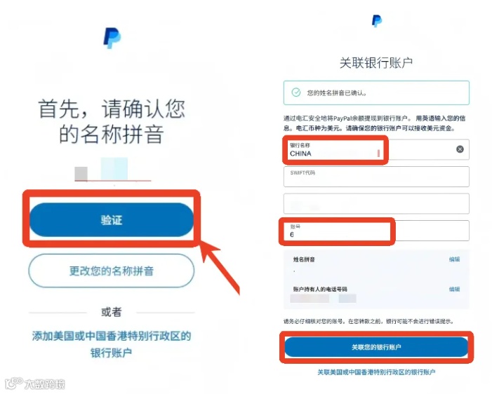 银行卡户名需与 PayPal 账户实名认证信息一致。
