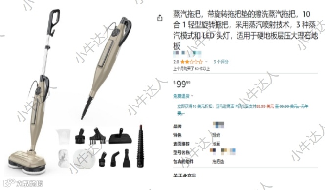 该产品于2024年4月2日在亚马逊平台上架(截至2024年7月4日)评分为3.3颗星,拥有6条来自买家的评论。在【蒸汽拖把】商品排行榜中排名第22名。