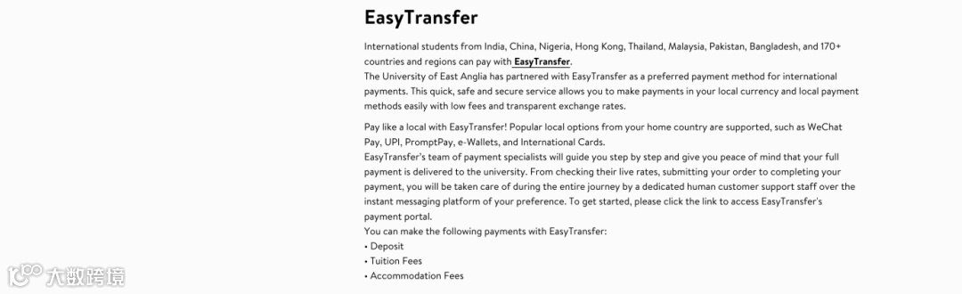 近日,跨境支付平台易思汇EasyTransfer与英国东安格利亚大学(University of East Anglia,简称UEA)正式达成官方合作,成为该校官方认可的学费缴纳渠道。目前,UEA官网已上线“易思汇EasyTransfer”缴费选项,服务覆盖全球170多个国家的留学生群体。