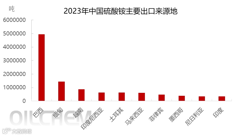 从出口市场分布看,2023年中国硫酸铵出口高度集中,前十国家出口总量达1068.27万吨,占总出口量的77.52%。其中,巴西以493.83万吨位居第一,占比35.83%;缅甸以144.91万吨排名第二,占比10.52%;越南位列第三,占比6.33%。12月出口量下滑主要受巴西需求萎缩影响,进而压制国内价格走势。