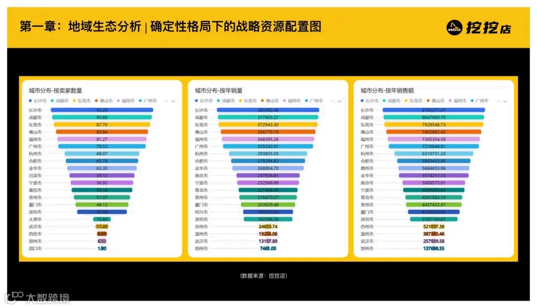 从卖家聚集度(卖家数量)、市场活跃度(产品销量)和价值产出(销售总额)三方面看,头部城市格局高度稳定,产业地理结构已趋于成熟,资源与价值流动路径被牢固锁定。