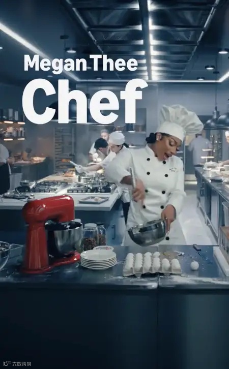 这是亚马逊官方在TikTok投的Prime Day广告素材,于6月下旬开始投放,发布当天的展现估值就有24万+。视频开头是美国说唱歌手Megan Thee看着手机屏幕惊喜地念出7月16-17日Prime Day,然后她发现了一款厨师机,点击buy now按钮,画面突转,她穿着厨师服在一个巨大的、专业的厨房搅鸡蛋。此时画面字幕显示的是“Megan Thee厨师”,角色转换。左下角摆着刚刚她购买的厨师机,红色外观在银白色的厨房格外显眼,视线很容易就聚焦到这抹红色上。