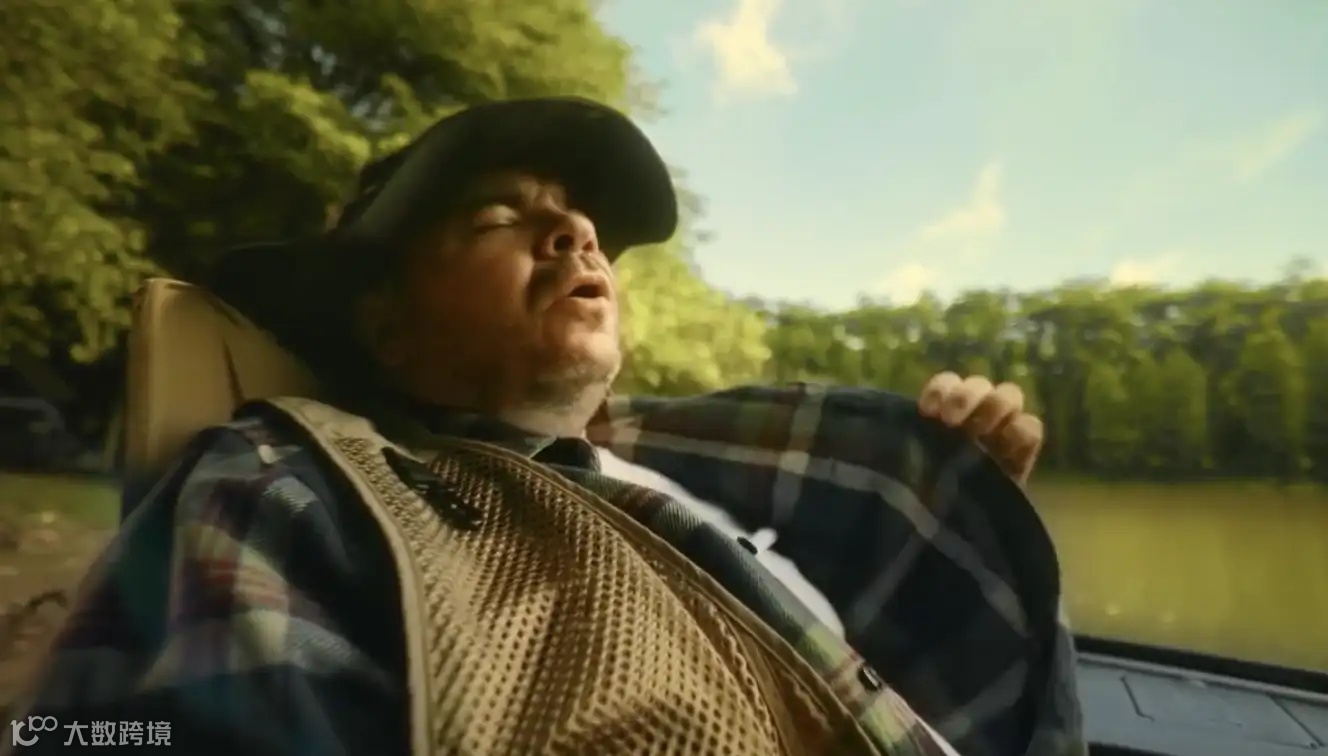 特写展示他热得满头大汗,汗水夸张得像雨水一样多。他打开冰桶拿啤酒喝,发现冰块早已化成一滩水。此时便携发电站以两块叠放在购物车中的形象出现,配合字幕“Don’t feel blue, feel BLUETTI!(别郁闷,来感受一下BLUETTI吧)”,按下开关键,画面切换到满是冰块的饮料箱,钓鱼人喝着冰啤酒,吹着电风扇。