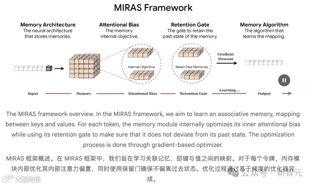 因此,MIRAS独特且实用的,在于它对AI建模的看法。它不再看到多样化的架构,而是看到解决同一问题的不同方法:高效地将新信息与旧记忆结合,同时不遗忘核心概念。