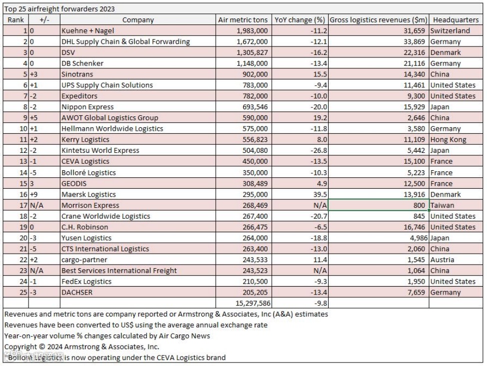 Armstrong and Associate的数据显示,2023年排名前25名的货运代理商的航空货运量同比下降9.8%,至1530万吨。
