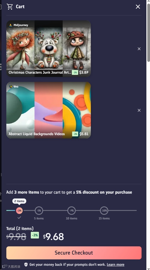 这个网站的UI也做的很细节,比如在用户加入购物车之后,会提醒用户买不同数量的Prompt可以享受不同的折扣,还做了一个可视化的折扣图,买的越多打折越多