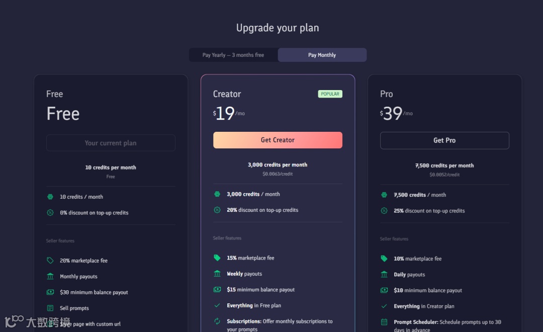 除了直接买卖Prompts, 还有订阅,这是它的plan: