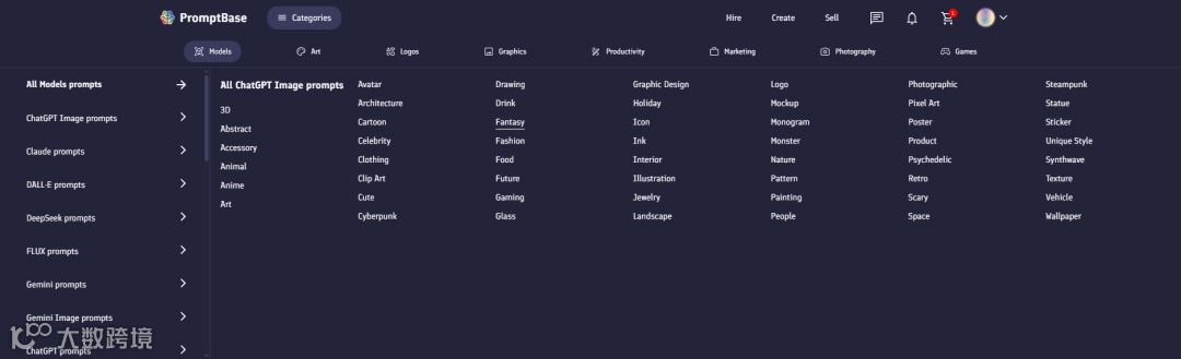 而每个模型下面又往下细分,比如ChatGPT Image prompts又分了3D, Abstrct, Accessories, Animals,又分了很多不同的场景和应用主题,比如 Clothing、Food、Interior、Anime、Clip Art、Future、Illustration、Art、Cute、Gaming、Jewelry、Cyberpunk
