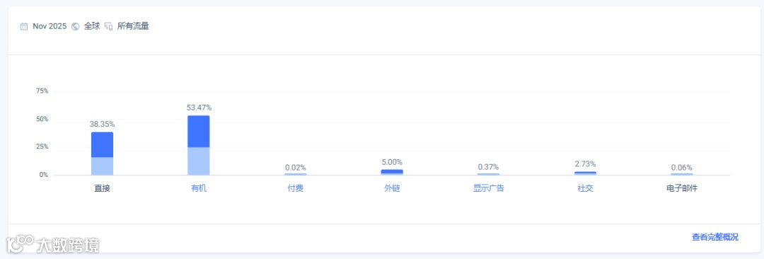 外链数量不少,一共5100个网站给它加了外链,平均一年1000多个链,再看看下它的流量来源。