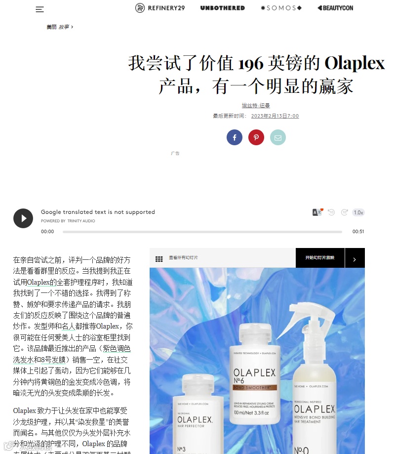 Refinery 29是专注女性消费者的时尚潮流媒体博客,月活跃用户高达570万,拥有极强的影响力。同一时间olaplex登上Refinery 29,编辑亲身试用的七款产品后给予了极具参考性的评价,传播范围进一步拓展至全球,精准触达众多美容与时尚消费人群。