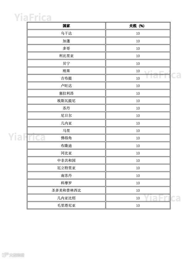 受这一法令影响的大多数非洲国家的关税为10%,这是美国在这一新关税政策中适用的最低关税水平。这些国家包括:埃及、摩洛哥、肯尼亚、埃塞俄比亚、加纳、坦桑尼亚、塞内加尔、乌干达、加蓬、多哥、利比里亚、贝宁、刚果、吉布提、卢旺达、塞拉利昂、埃斯瓦提尼(又称斯威士兰)、苏丹、尼日尔、几内亚、马里、佛得角、布隆迪、冈比亚、中非共和国、厄立特里亚、南苏丹、科摩罗、圣多美和普林西比、几内亚比绍和毛里塔尼亚。整理图表一览如下: