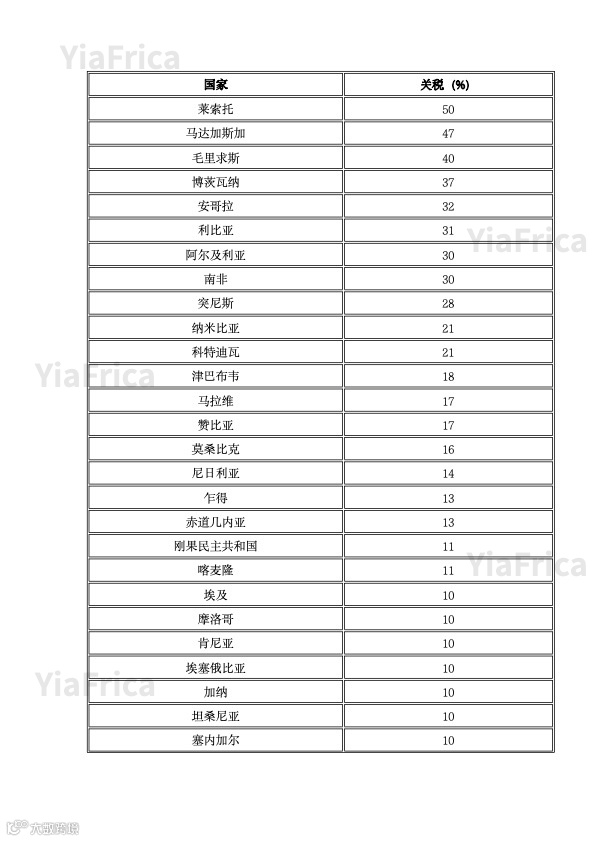 共有51个非洲国家上榜,关税从10%到50%不等。