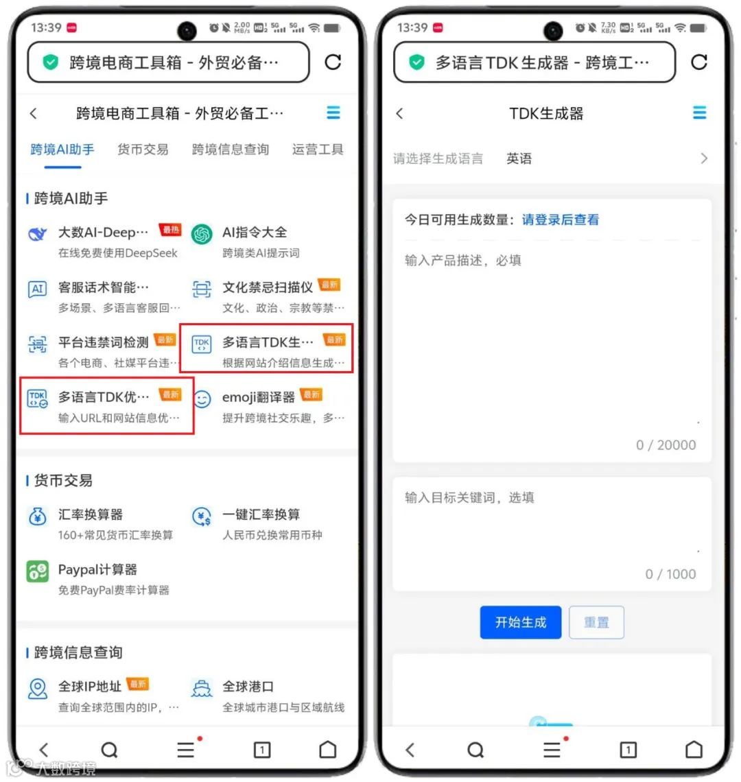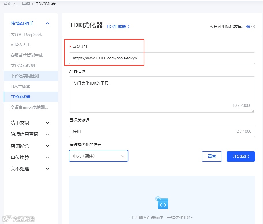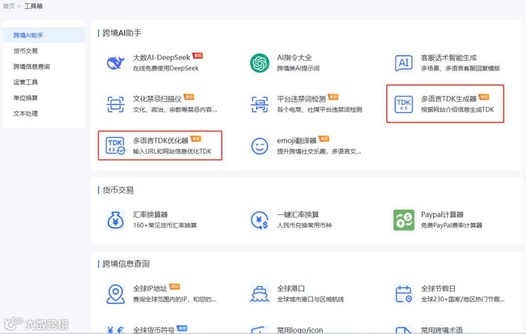 2、进入大数网站——【工具箱】——【多语言TDK生成器】/【多语言TDK优化器】