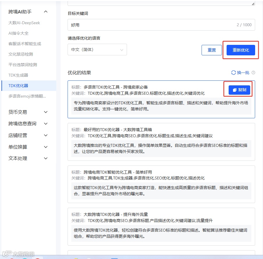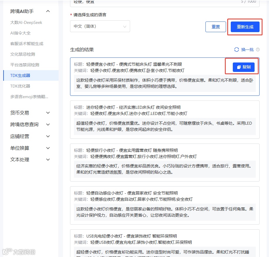 小工具会智能生成多项相关的TDK,选择满意的一项进行复制就可以了,不满意也可以重新生成。