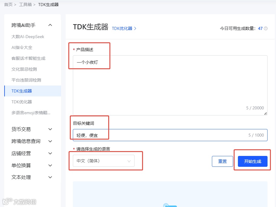将产品描述、关键词输入对应的文本框中,选择想要生成的语言,点击“开始生成”按钮,等待几秒钟。