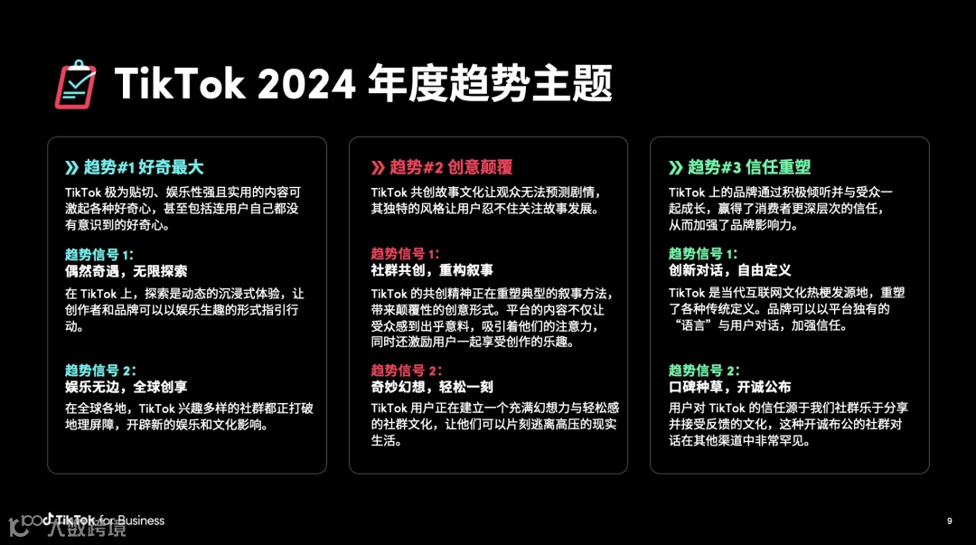 在 TikTok 上实现突破意味着,广告主需要将“勇于尝试,大胆破局”这一理念充分地融入到日常的营销策略当中。 基于此理念,我们通过分析那些生命周期更长、影响力更大且具有行动指导意义的常青趋势,总结出了三大年度趋势主题:「好奇最大」、「创意颠覆」与「信任重塑」,为品牌 2024 年在 TikTok 内外的营销策略提供指引。