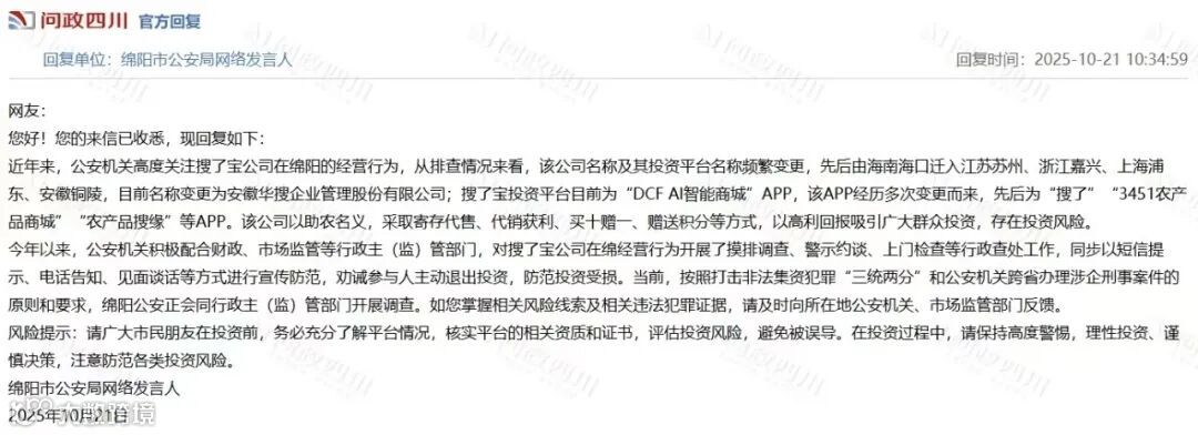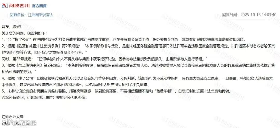 2025 年 7 月,四川绵阳江油公安明确警示,搜了宝 “具有明显的涉嫌非法集资和传销风险,投资不受法律保护”;
